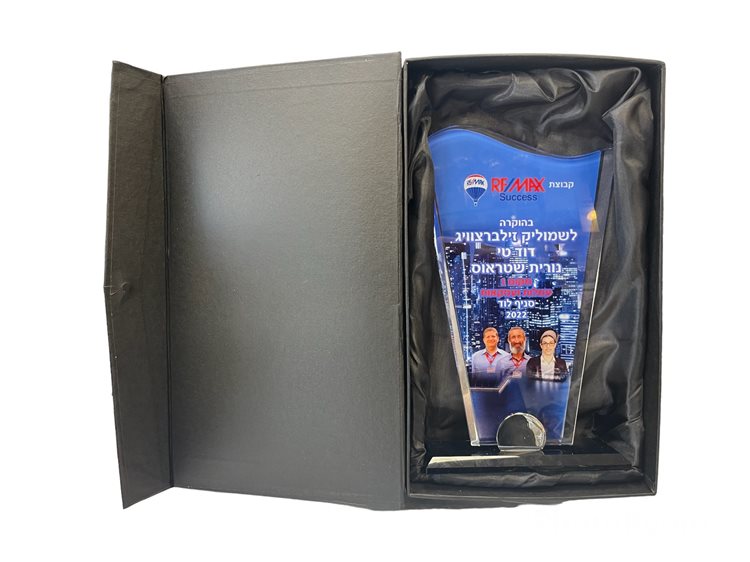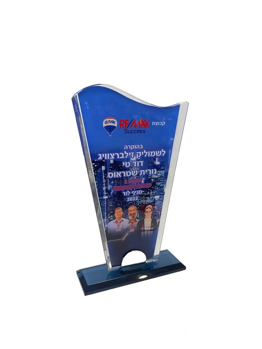 מגן הוקרה עשוי מקריסטל בעובי 10 מ"מ עם בסיס קריסטל שחור והדפסה צבעונית ישירה