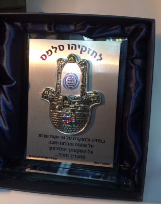 מגן הוקרה זכוכית מלבני משולב בלוח הקדשה+חמסה בגודל של 12 ס"מ ציפוי כסף 925