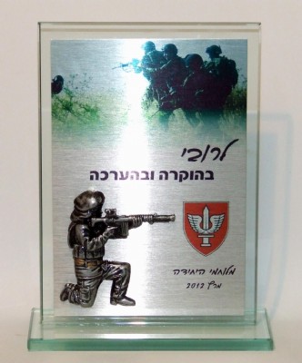 מגן הוקרה זכוכית מלבני עם לוח מתכת ותבליט חייל