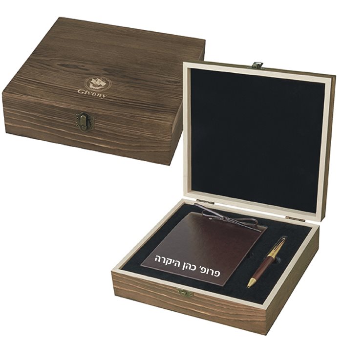 נארז בלוק נייר דמוי עור+ עט וקופסת עץ מהודרת