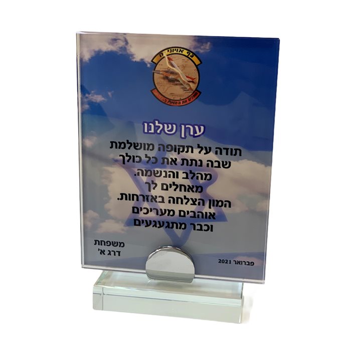 מגן הוקרה זכוכית+הדפסה ישירה 20*15 ס"מ