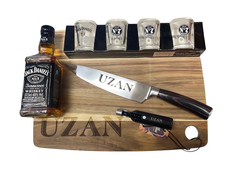 קרש חיתוך 38*30 ס"מ +סט כוסות שוט ובקבוק ג'ק דניאלס עם סכין כולל חריטה אישית ותותחן